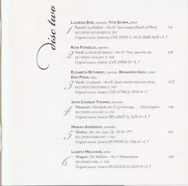 | 2-1 | Tito Schipa, Lucrezia Bori: La Bohème-Act IV: Sono Andati (Death Of Mimi) | 7:41 min | |