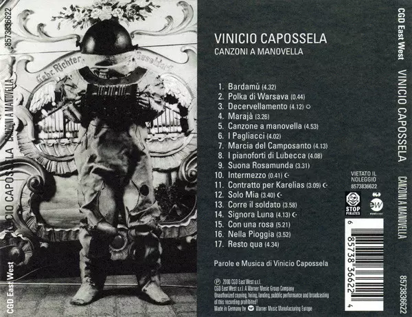Vinicio Capossela: Canzoni A Manovella version on CD in Standard edition. This particular edition was published in Italy in publishing company CGD East West on 30. October 2001. Album spans genres Rock, Pop, Folk, World, & Country, Blues, Balad and Alternative rock.