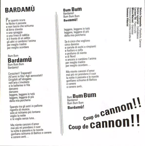 Bass Drum Mirco Mariani | Double Bass Enrico Lazzarini | Grand Piano, Other [Cannon] Vinicio Capossela | Piano [Piano Roll] Luciano Titi | Written-By [Strings], Conductor [Strings Orchestra] Tommaso Vittorini