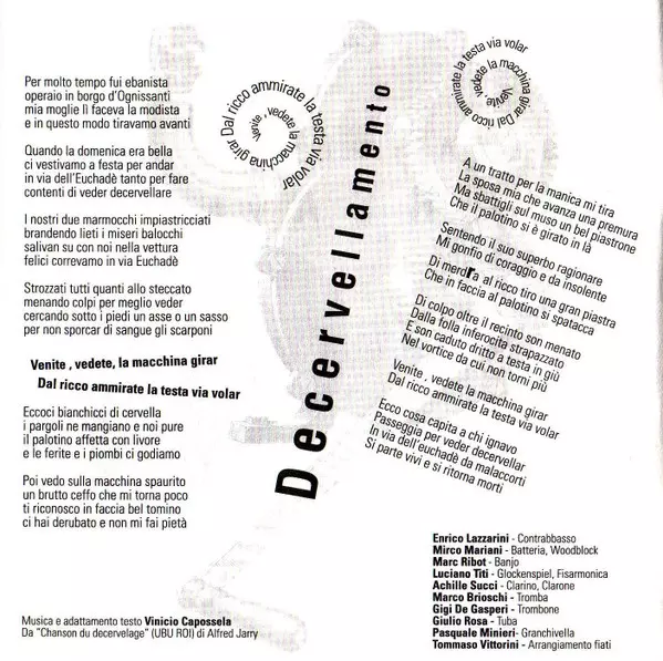 Arranged By [Brass] Tommaso Vittorini | Banjo Marc Ribot | Double Bass Enrico Lazzarini | Drums, Wood Block [Woodblock] Mirco Mariani | Glockenspiel, Accordion Luciano Titi | Performer [Granchivella] Pasquale Minieri | Trombone Luigi De Gaspari | Trumpet Marco Brioschi | Trumpet [Clarino], Bass Clarinet Achille Succi | Tuba Giulio Rosa