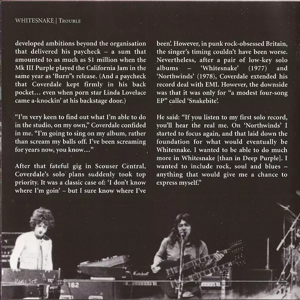"Trouble" was WHITESNAKE's first full-length album and was released a few months after the "Snakebite EP"! With this album WHITESNAKE laid the musical and visual foundation for their future career in 1978. The line-up was made up of old veterans including Coverdale, Bernie Marsden, Micky Moodie and former Deep Purple keyboardist Jon Lord. The en...