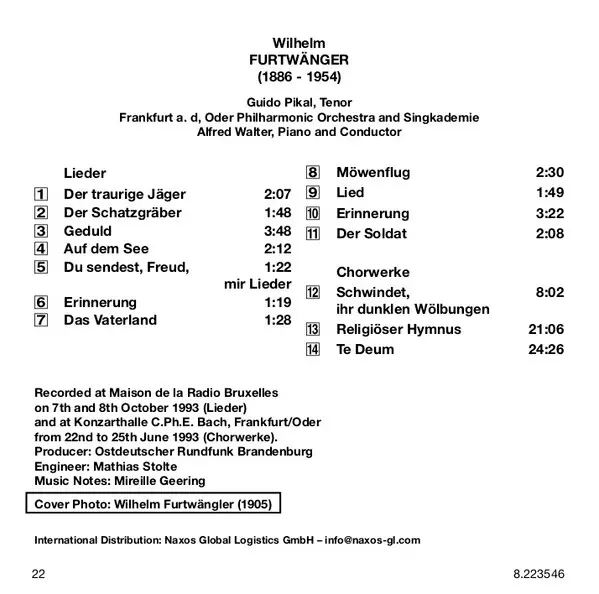 | Artist | Wilhelm Furtwängler | Alfred Walter | Guido Pikal | Philharmonisches Orchester Frankfurt (Oder) | Frankfurt a.d. Oder Singakademie |