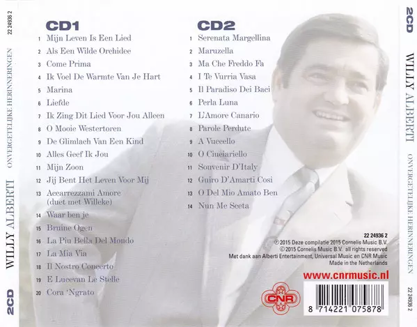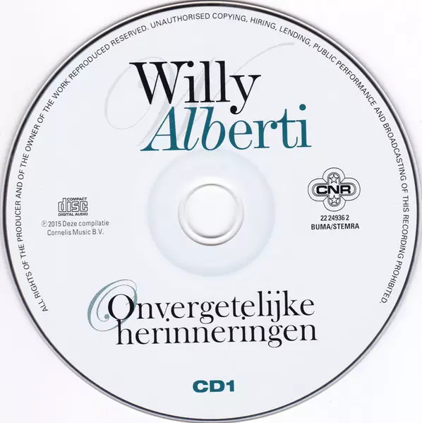 Willy Alberti: Onvergetelijke Herinneringen version on 2CD in Standard edition. This particular edition was published in Netherlands in publishing company Cnr on 30. April 2015. Album spans genres Pop and Vocal.