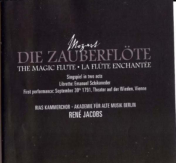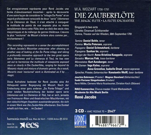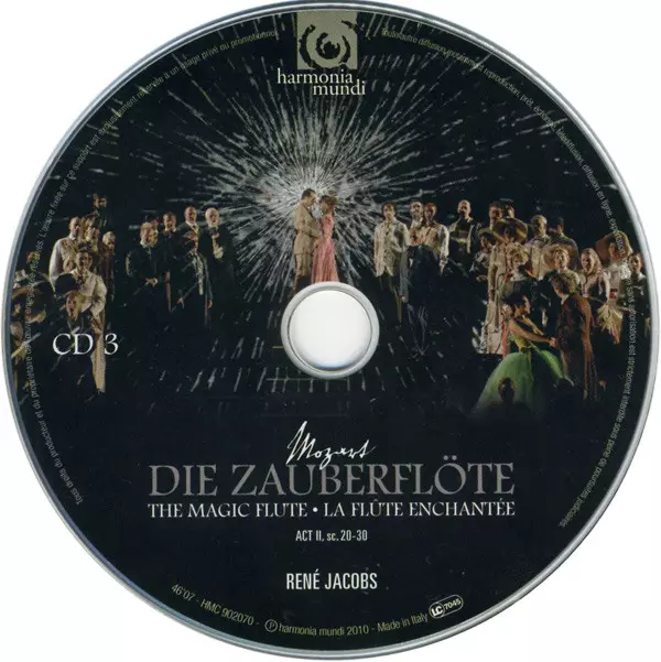 Wolfgang Amadeus Mozart: Die Zauberflöte version on 3CD in Standard edition. This particular edition was published in Europe in publishing company Harmonia Mundi on 7. October 2010. Album spans genres Classical and Opera.