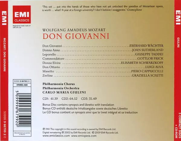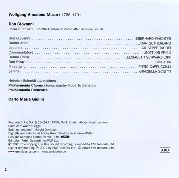 | Artist | Wolfgang Amadeus Mozart | Philharmonia Orchestra | Carlo Maria Giulini | Joan Sutherland | Elisabeth Schwarzkopf | Philharmonia Chorus | Piero Cappuccilli | Gottlob Frick | Eberhard Wächter | Luigi Alva | Giuseppe Taddei | Graziella Sciutti |