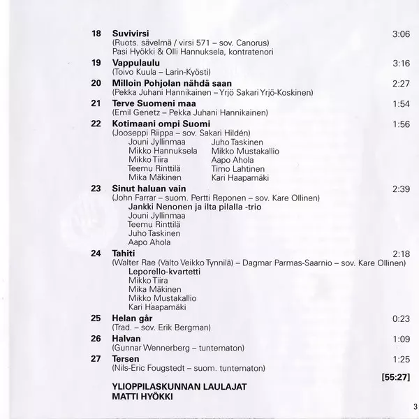 Arranged By Sakari Hildén | Vocals Aapo Ahola, Jouni Jyllinmaa, Juho Taskinen, Kari Haapamäki, Mika Mäkinen (3), Mikko Hannuksela (2), Mikko Mustakallio, Mikko Tiira, Teemu Rinttilä, Timo Lahtinen | Written-By Jooseppi Riippa