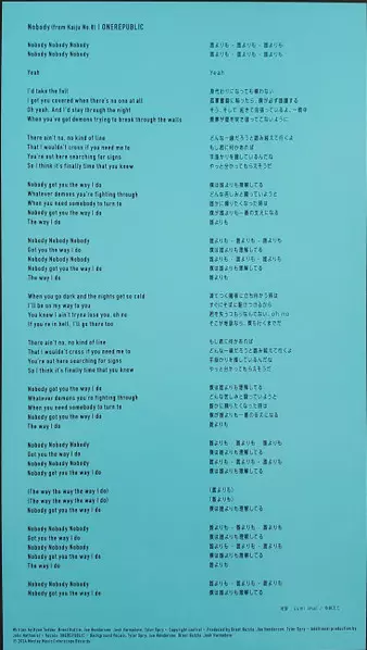 | Backing Vocals, Written-By Josh Varnadore | Producer [Additional] John Nathaniel | Producer, Backing Vocals, Written-By Brent Kutzle, Joe Henderson (12), Tyler Spry | Vocals OneRepublic | Written-By Ryan Tedder | |||