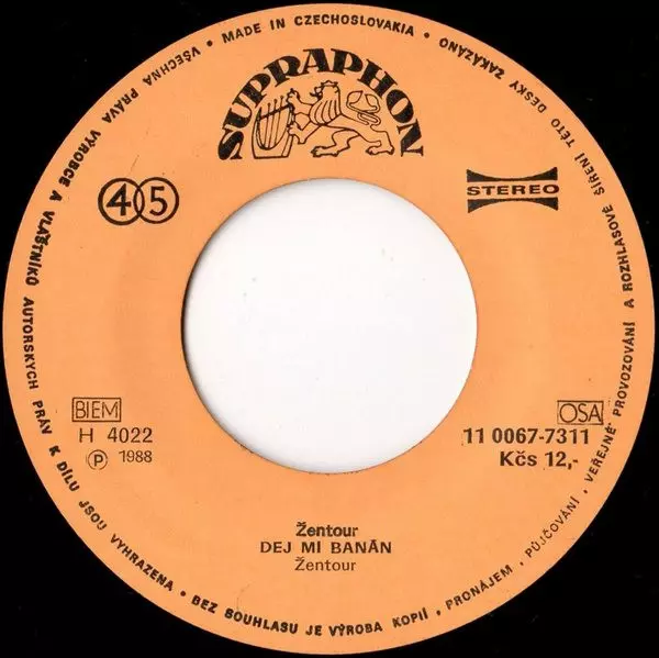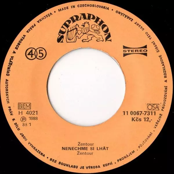 Žentour: Nenechme Si Lhát / Dej Mi Banán version on vinyl SP in 45 RPM edition. This particular edition was published in Czechoslovakia in publishing company Supraphon year 1988. Album spans genres Rock, Pop, Electronic and Europop.