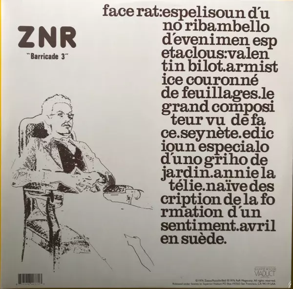 A Marseille based left-field experimental group formed in the mid 1970's. ZNR originally stood for Zazou - Néneux - Racaille, key members of the pioneering underground band Barricade augmented by a floating roster of other talent of the left-field, folk and jazz scenes. ZNR made tw...