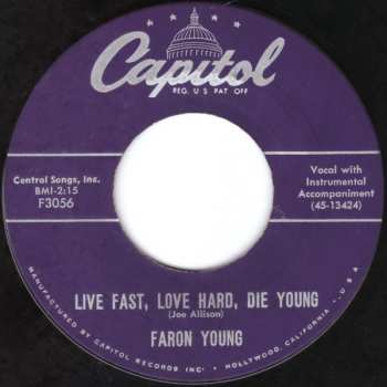 US-american country music singer, guitarist and songwriter from the early 1950s into the mid-1980s. Born February 25, 1932 in Shreveport, Louisiana, USA; died December 10, 1996 in Nashville, Tennessee, USA. Hits including "If You Ain't Lovin' (You Ain't Livin')" and "Live Fast, Love Hard, Die Young" marked him as a honky-tonk singer in sound and personal style. Known as the "Hillbilly Heartthrob", and following a movie role, the "Young Sheriff", Young's singles reliably charted for more than 30 years. He committed suicide in 1996. Young is a member of the Country Music Hall of Fame.